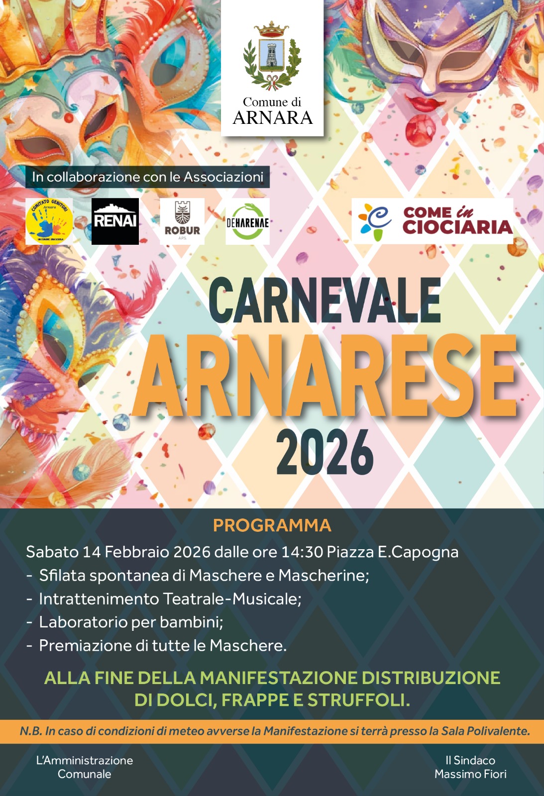 L’ A.s.d. Comeinciociaria partecipra in maschera in bici la Carnevale Arnarese 2026 il 21 Febbraio in collaborazione con le associazione del territorio.